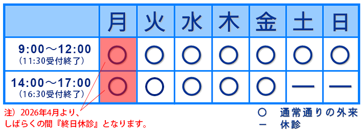 - 2026年4月より暫くの間、毎週月曜日は終日休診とさせていただきます。